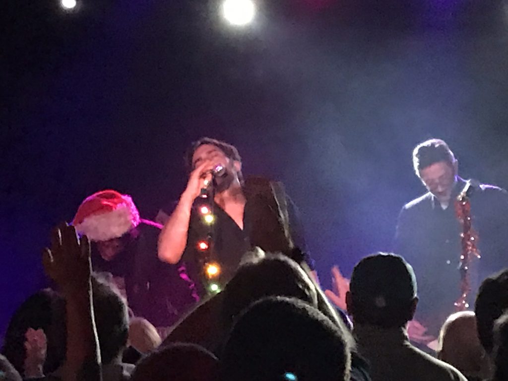 Oh yeah — don’t forget the Santa costumes, constantly swirling simulated snow (which eventually left the frontmost band members completely drenched and dripping), and a late visit to the stage by Santa himself, accompanying the band on rollicking versions of seasonal classics like Chuck Berry’s “Run, Run, Rudolf,” “Holly Jolly Christmas,” “Auld Lang Syne” and even “Hava Nagila.”