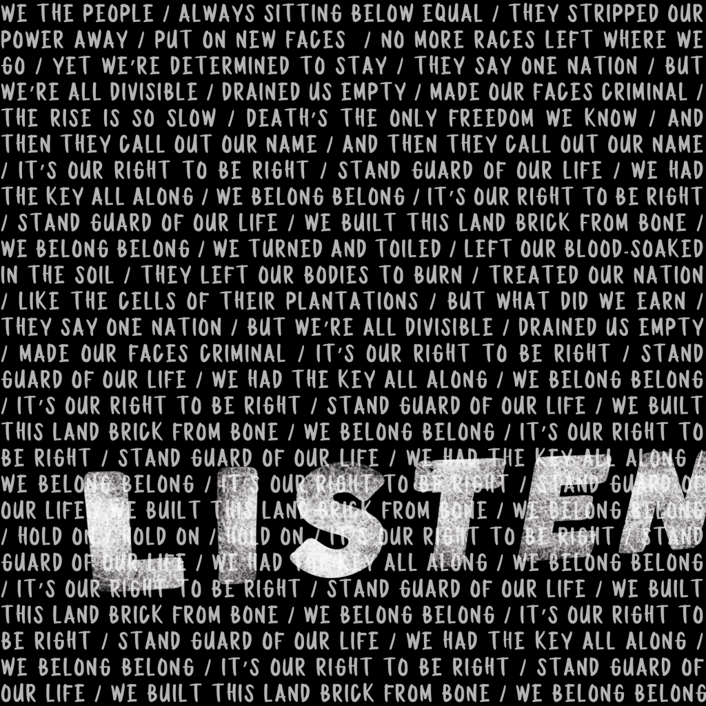 The intro to “Listen” is groovy and soulful with some backing vocals by Christina Harrison and Maureen Murphy that are somewhere on the soul-gospel scale. It’s a mellow tone which stand in direct contrast to the confrontation of the opening lyrics, “Why ya gotta interrupt when I’m not done talkin’? I need you to keep it shut. This ain’t up for discussion.” As the song progresses, the melody has some similarities to Portishead – especially in the rhythm section (Ryan Madora on bass and Derrek Phillips on drums).