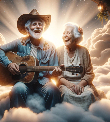 It amazed me to enter a simple request, such as “create an image of an old man wearing a western hat and an old woman, both happily singing in a heavenly setting. The man is playing an old acoustic guitar, while the woman sings alongside him,” and receive a picture like this: